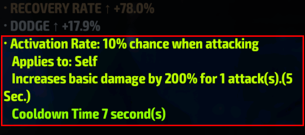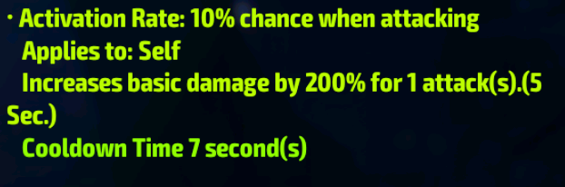 The important part is the actual effect of the damage increase. This example here shows that while the proc is active, it increases the character’s damage by 200%, for 1 attack, and lasting a maximum 5 seconds. Let's break this down further: